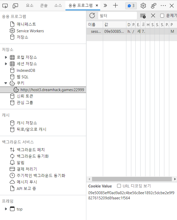 여기서 세션값을 우리가 직접 변경할 수 있는데, 바로 위에서 확인한 admin의 세션아이디로 변경해보겠다.
