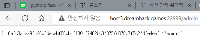 '/admin'이 따라붙는 url로 접속하면 session_storage에 있는 값들을 보여주는 것으로 보인다.