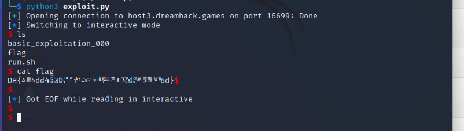 Description 이 문제는 서버에서 작동하고 있는 서비스(basicexploitation000)의 바이너리와 소스 코드가 주어집니다. 프로그램의 취약점을 찾고 익스플로잇해 셸을 획득한 후, "flag" 파일을 읽으세요. "fla