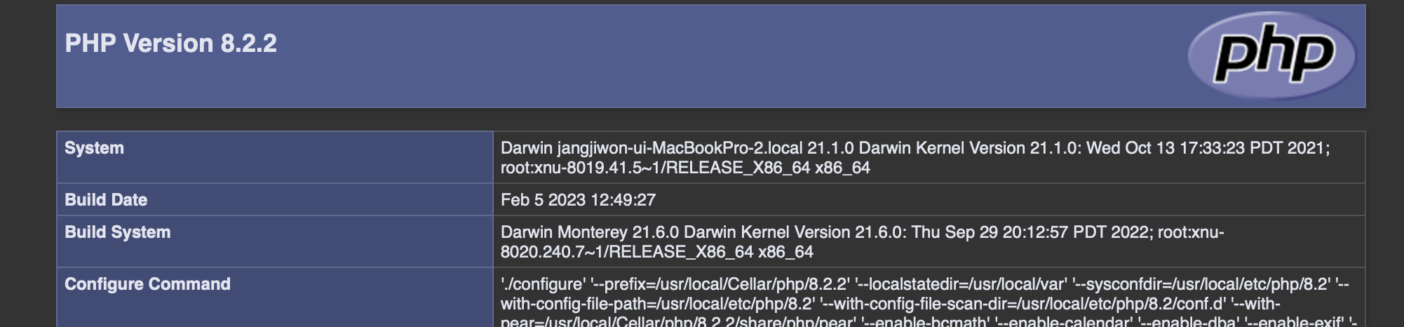 - LoadModule php_module /usr/local/opt/php@8.2/lib/httpd/modules/libphp.so 문장 추가, 경로는 마찬가지로 pc마다 다를 수 있으니 확인 해볼 것