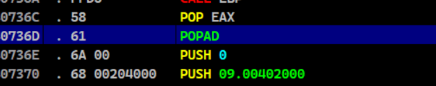 UPX 패킹의 특징은 'PUSHAD' ~ 'POPAD' 명령어 내부에서 압축해제 코드가 실행 되고 'POPAD' 명령어 실행 후 'JMP' 명령어를 통해 OEP로 이동하는 구조라는 것이다.